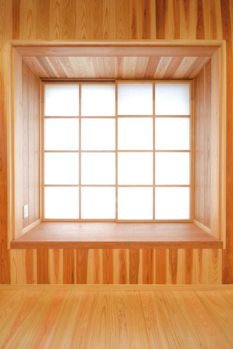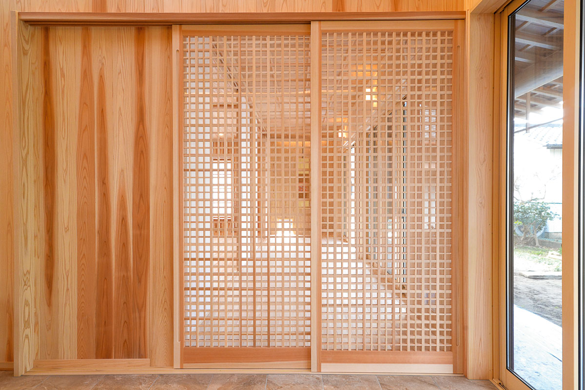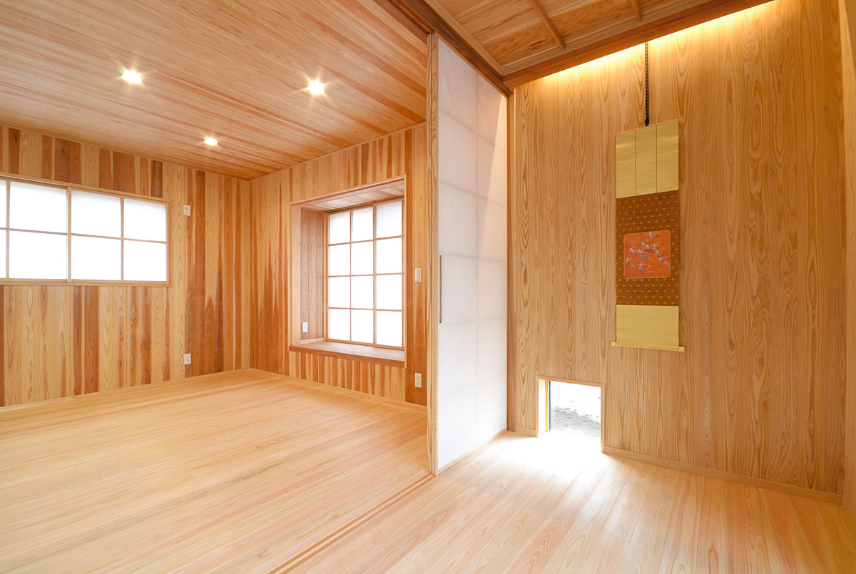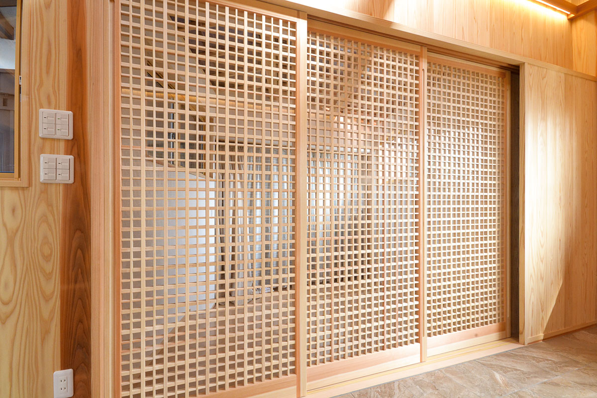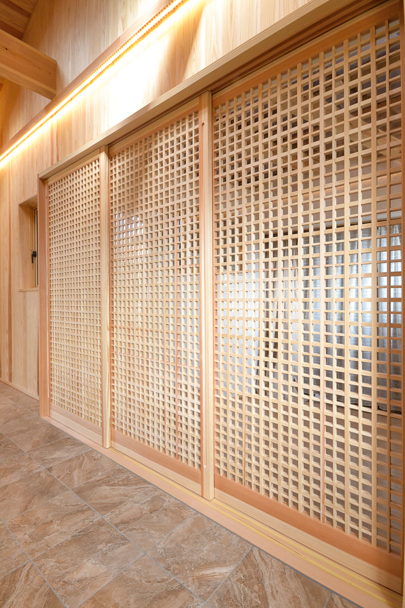 建具をはじめ、細部まで拘り抜いた住宅です。 丸太は、北山杉(約13メートル)のものを、床には檜をふんだんに使用しています。