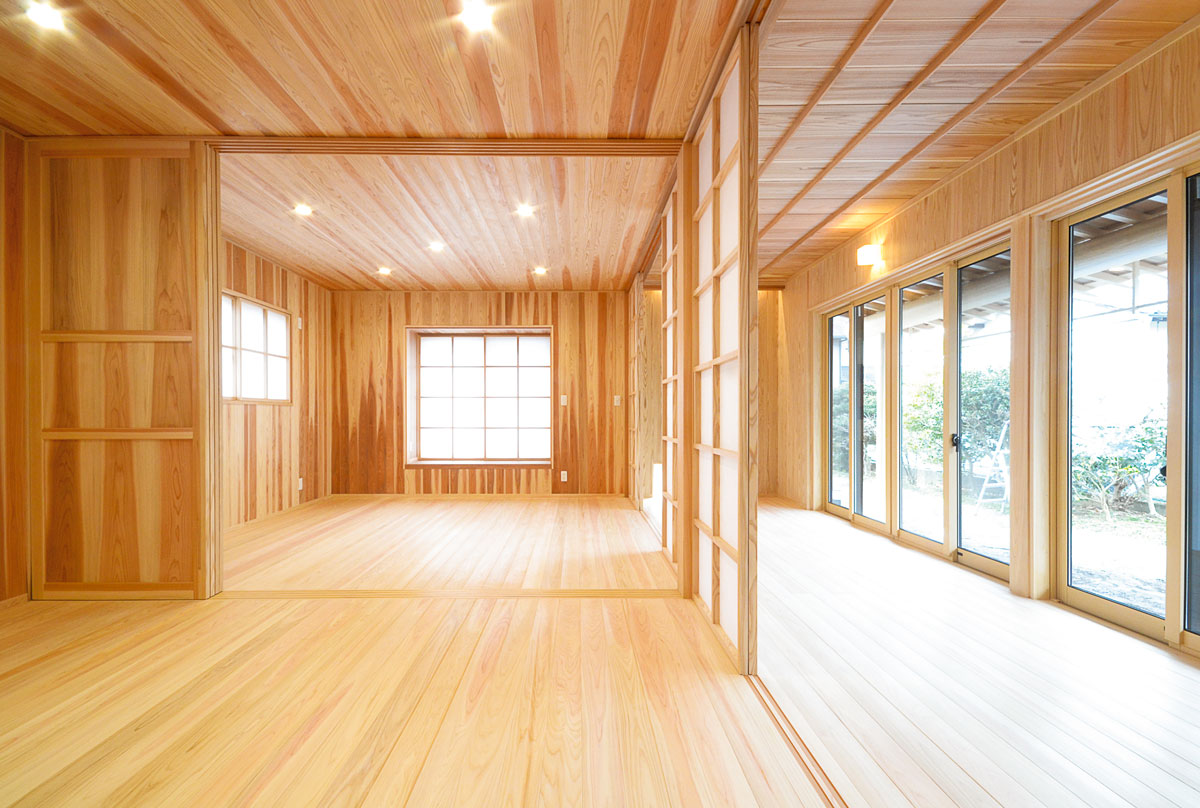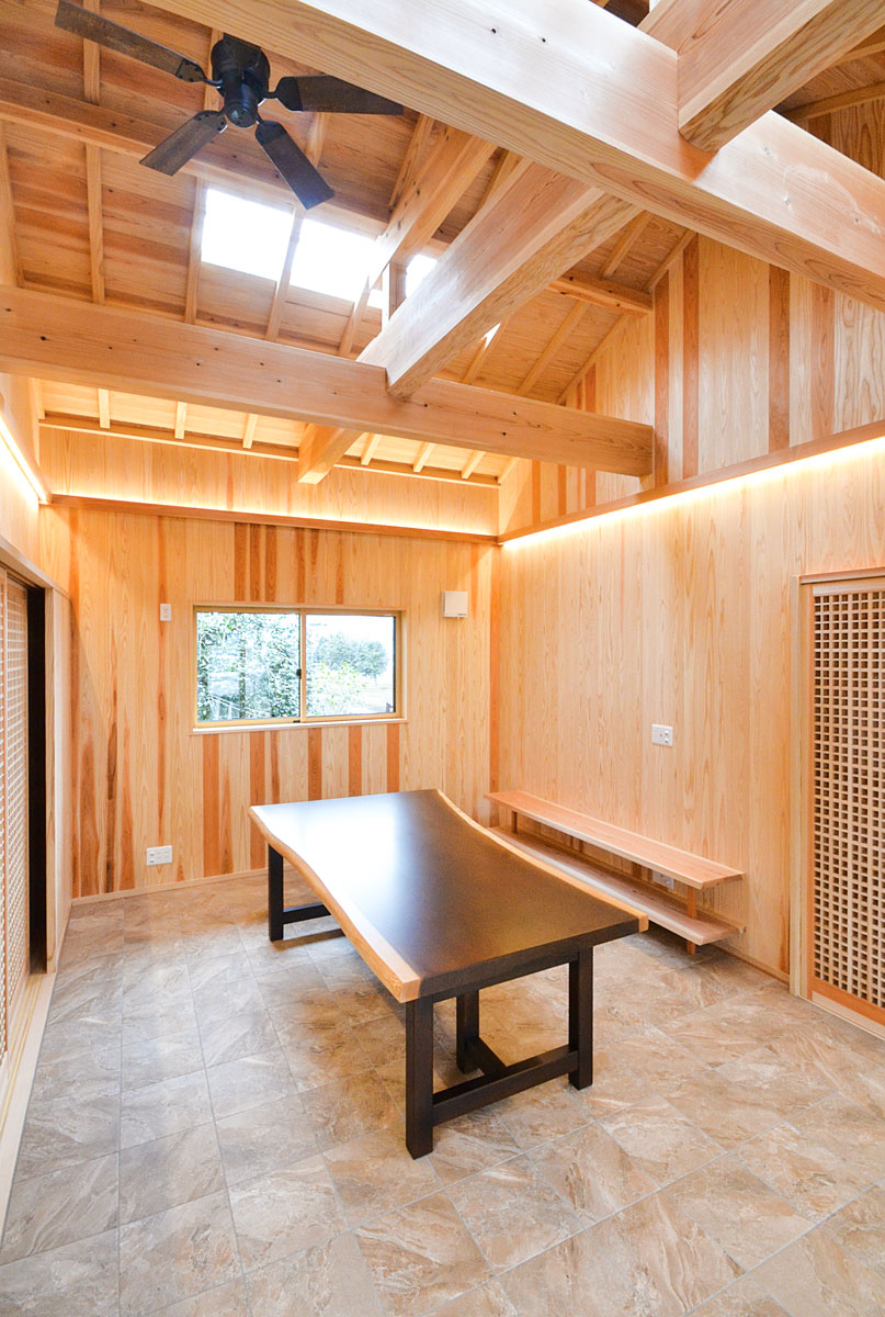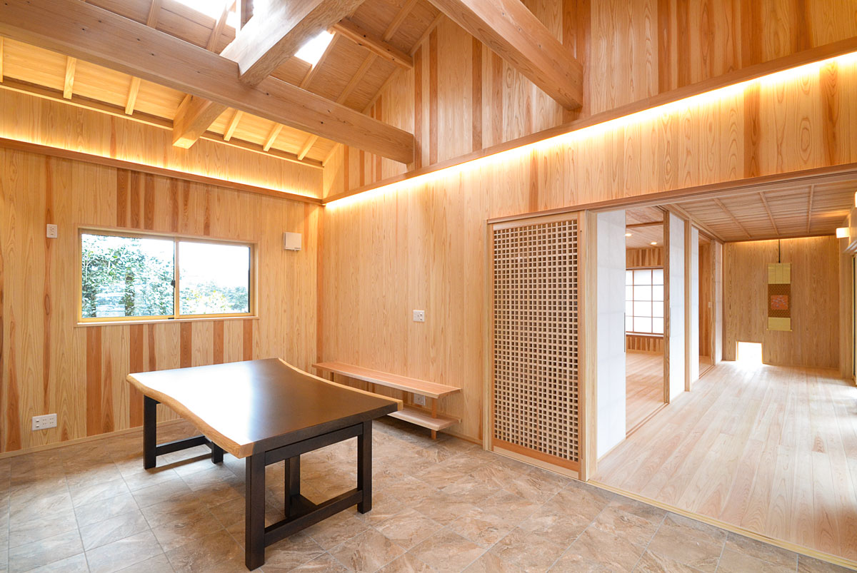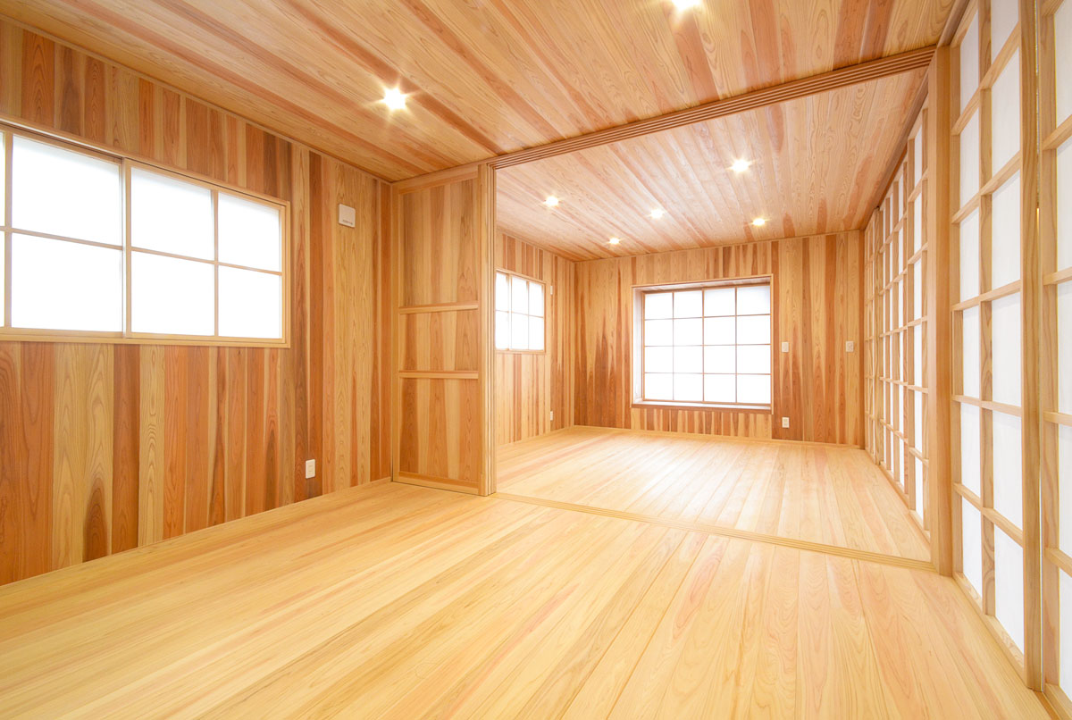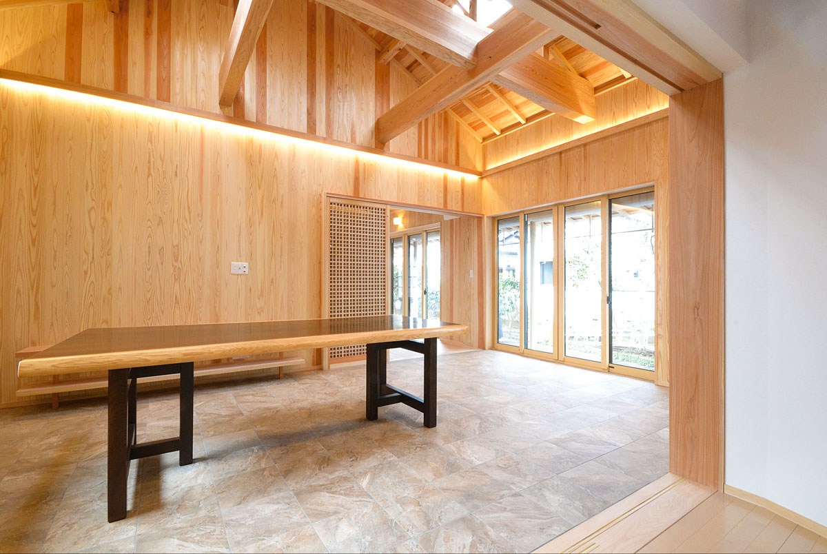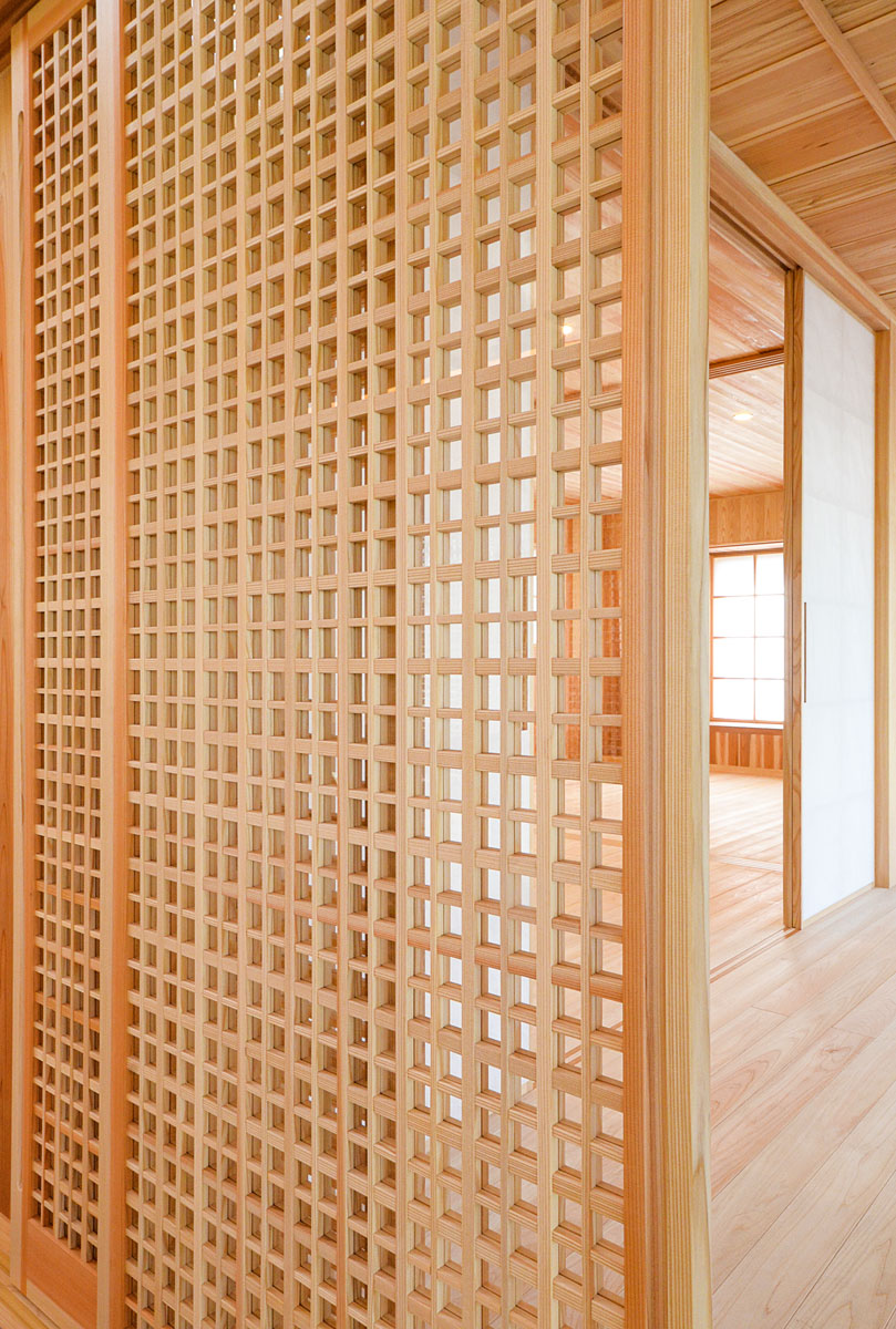 建具をはじめ、細部まで拘り抜いた住宅です。 丸太は、北山杉(約13メートル)のものを、床には檜をふんだんに使用しています。