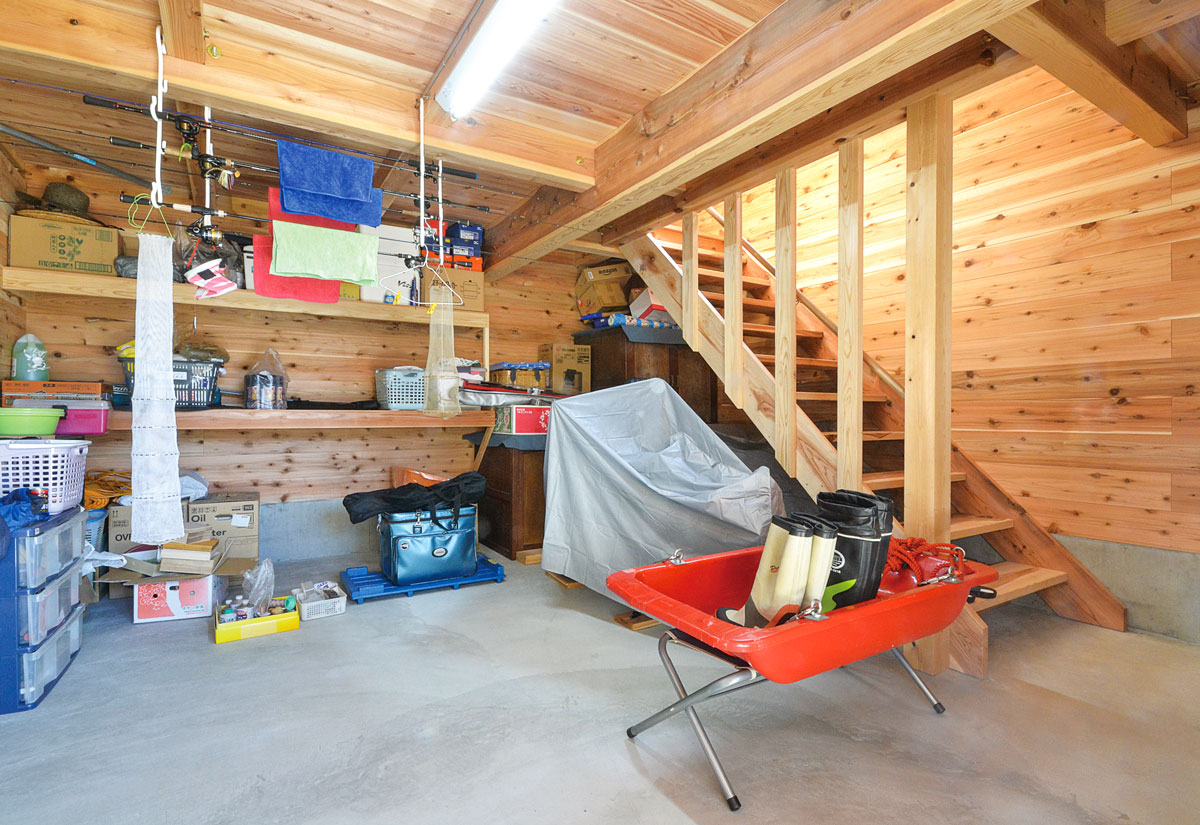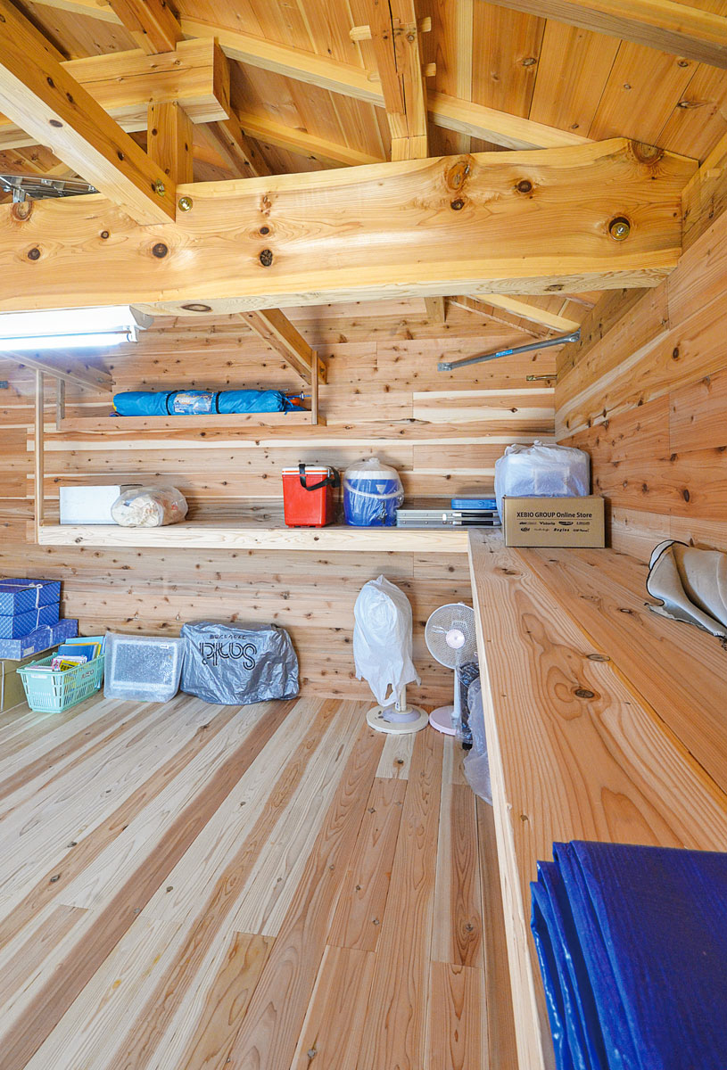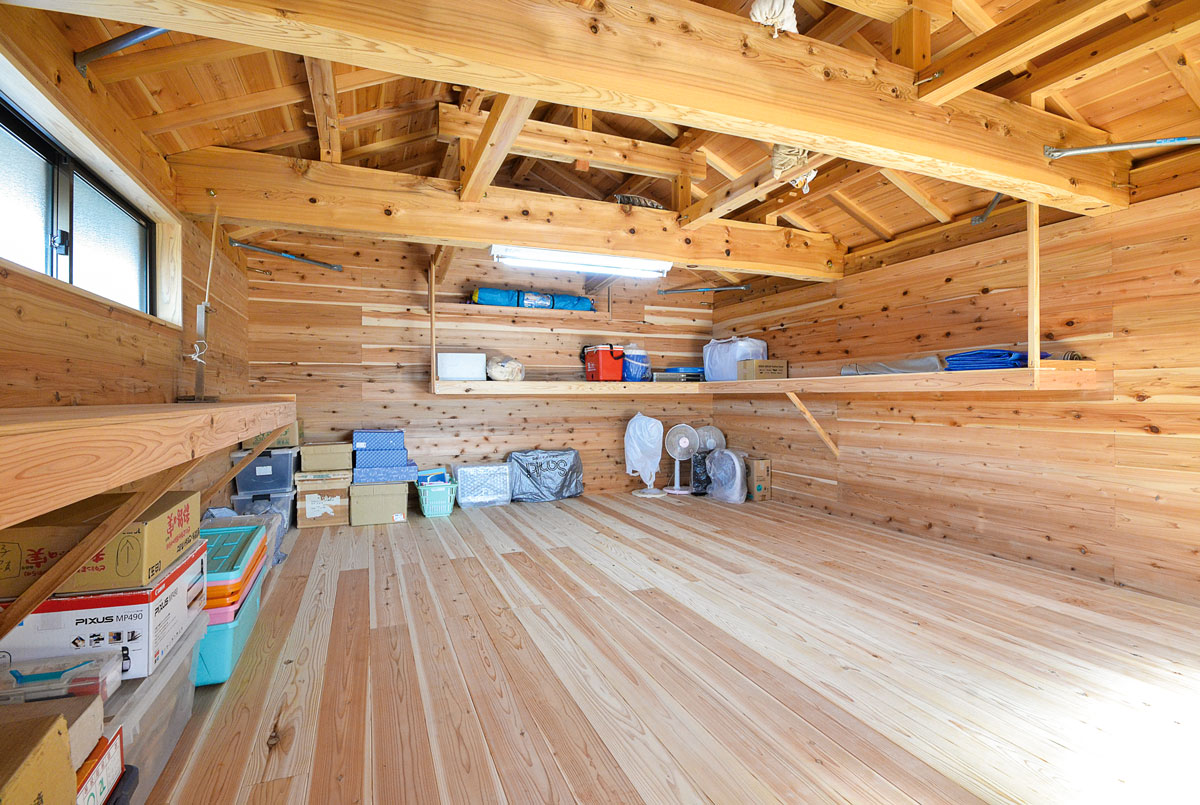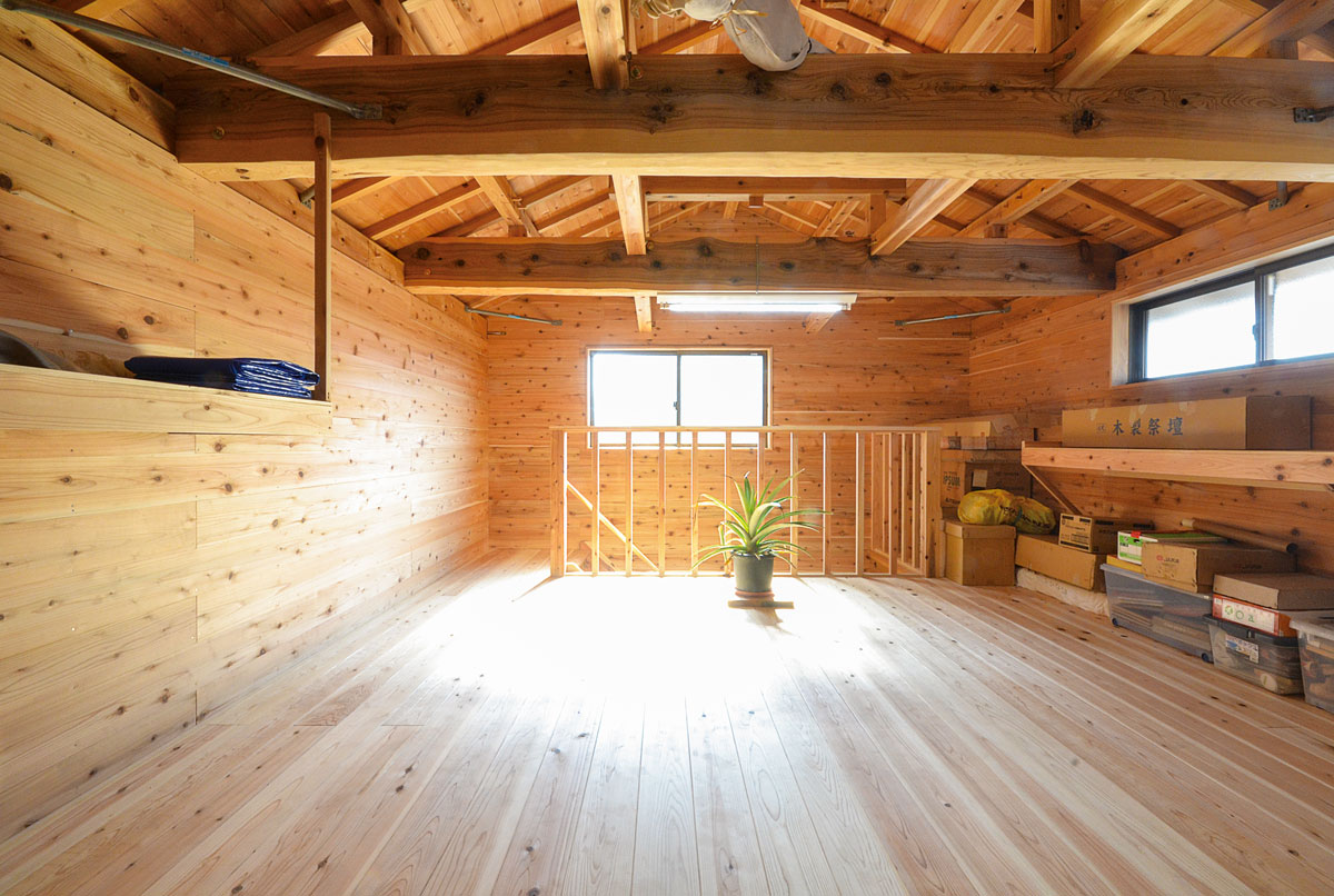物置を改築した趣味の為だけの空間です。 小屋組や大きな梁、木材の美しさをデザインに取り入れました。