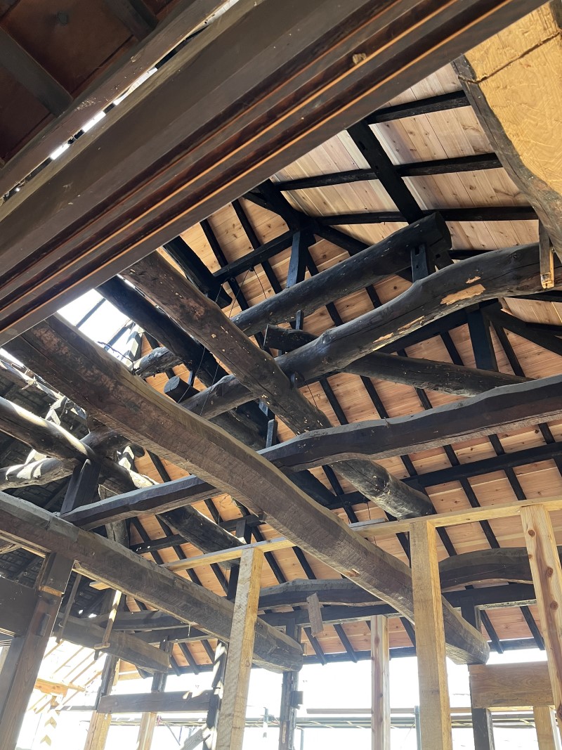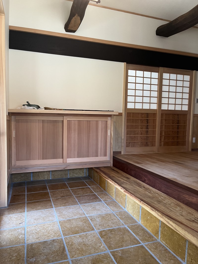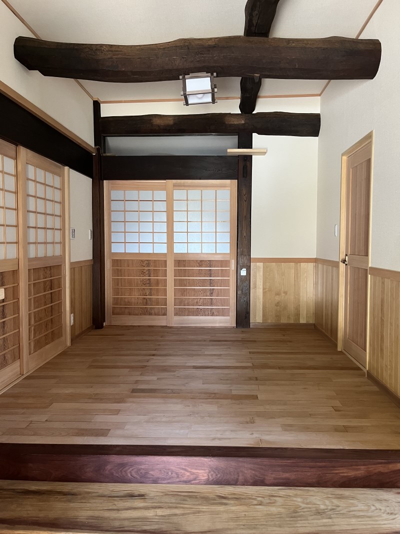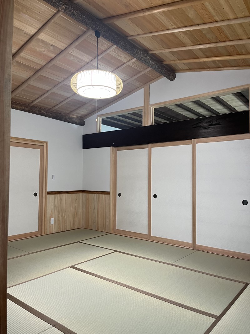 古民家をフルリフォーム。屋根は瓦からガルバリウムに、天井は船底天井に仕上げ、思い出の梁はそのままにリノベーションしました。